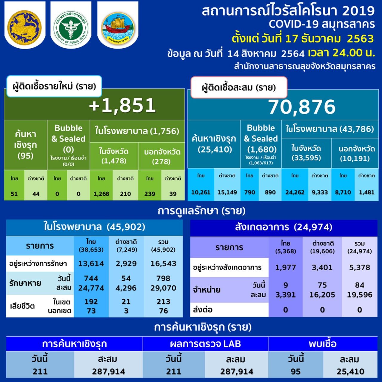 สำนักงานสาธารณสุขจังหวัดสมุทรสาคร พบผู้ติดเชื้อรายใหม่พุ่งสูงสุด 1,851 ราย ติดเชื้อสะสม 70,876 ราย เสียชีวิตรายวัน 13 ราย มีเตียงสนามว่างเพียงพอ