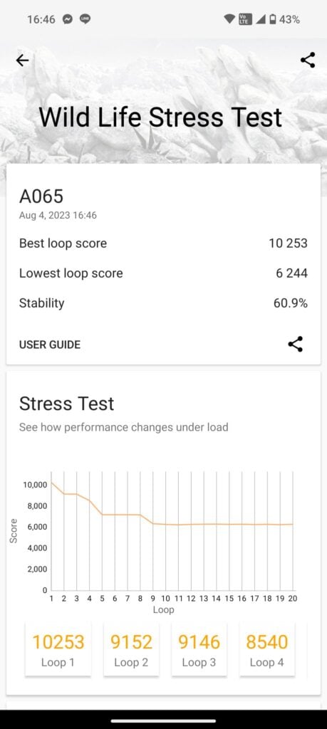 การทดสอบ Geekbench 6.1.0 ได้ให้คะแนน Single Core อยู่ที่ 1737 คะแนน และ Multi Core อยู่ที่ 4573 คะแนน ส่วนการทดสอบบน 3D Mark ชุด Wild Life Stress Test ที่ปกติแบไต๋เราชอบเอามาทดสอบประสิทธิภาพกัน จะได้คะแนนสูงสุดอยู่ที่ 10,253 คะแนน และนิ่งที่ 60.9 % เท่านั้น ถามว่าเป็นคะแนนที่เยอะไหม จัดว่าค่อนข้างดีเลยทีเดียว แม้จะไม่ตรงตามมาตรฐานสมาร์ตโฟนเรือธงในปีนี้เท่าไหร่นัก แต่ผู้เขียนมั่นใจได้เลยว่า การใช้งานทั่วไป ไปจนถึงเล่นเกมสามารถให้ประสบการณ์ที่ดีได้แน่นอน (เพราะก็เล่นมาหลายเกมอยู่ ฮา)