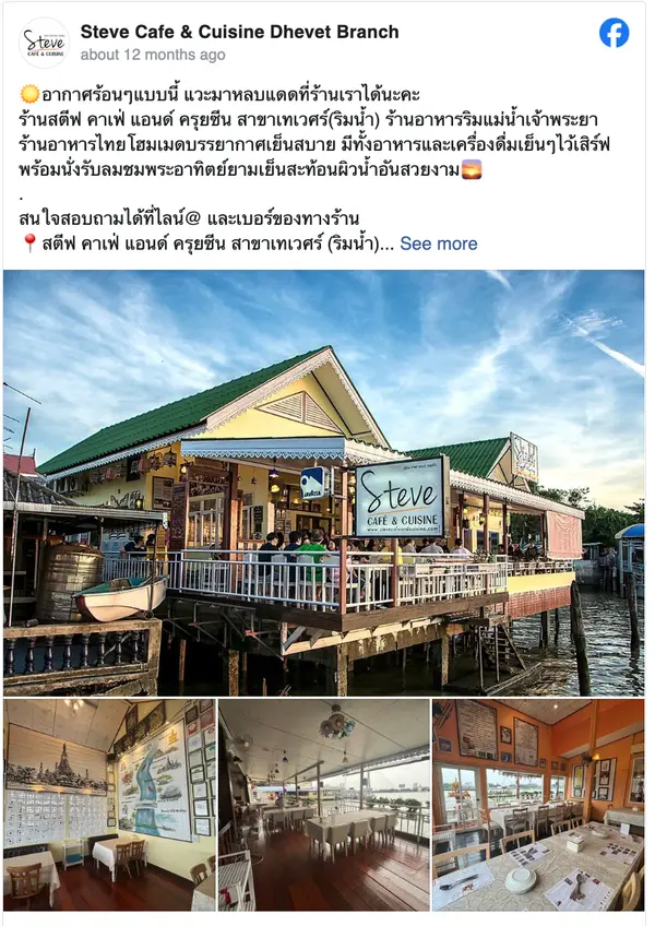 ร้านอาหารไทยชื่อดังริมแม่น้ำเจ้าพระยา ที่โดดเด่นทั้งรสชาติอาหารและวิวแม่น้ำ บรรยากาศสบาย ๆ เหมาะกับการพาครอบครัวมานั่งทานอาหารในวันพิเศษหรือช่วงวันหยุด เมนูของที่นี่เน้นอาหารไทยรสชาติจัดจ้านแบบต้นตำรับ วัตถุดิบคุณภาพดีและปรุงสดใหม่ทุกจาน เมนูที่หลายคนแนะนำเมื่อมาแล้วต้องลอง เช่น แกงเหลืองปลากะพง, หมูชะมวง, กุ้งแม่น้ำเผา, ยำส้มโอ และ ปลากะพงทอดน้ำปลา ที่รสชาติกลมกล่อม ทานง่าย เหมาะกับการสั่งมาแชร์กันทั้งโต๊ะ พร้อมนั่งชมวิวแม่น้ำเจ้าพระยาไปด้วย ถือเป็นอีกหนึ่งร้านที่เหมาะกับการพาครอบครัวมาฝากท้องและใช้เวลาร่วมกันแบบสบาย ๆ